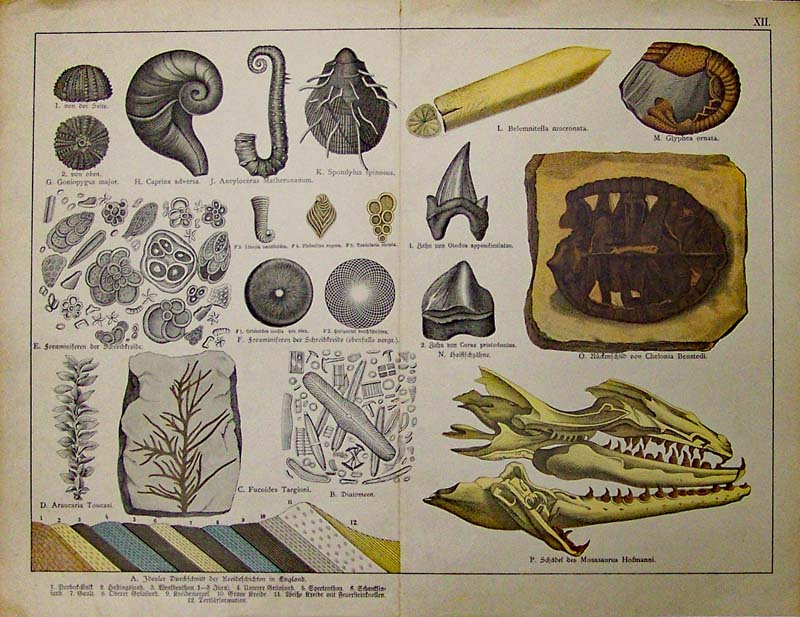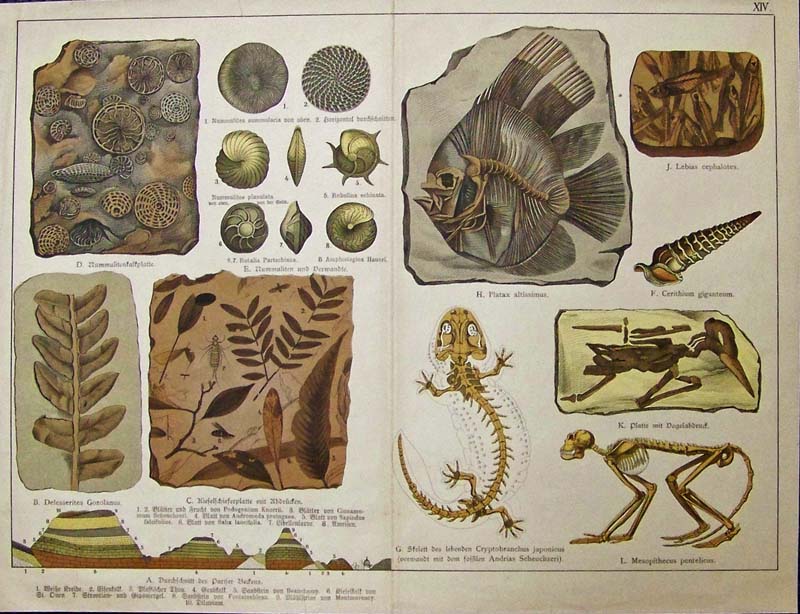 020science: C.1875 Chromolithograph showing fossils of fish, leaves, shells, vertebrae and animal skeletons with German text. 15 x 11-1/2 in. $60