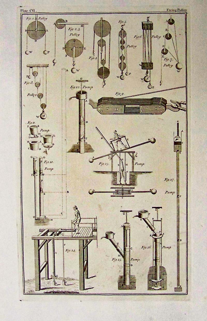 022science: 1765 Copper engraving in Plate CVI showing the mechanisms of a Facing Pulley in several Figures. 14 x 9 in. $90