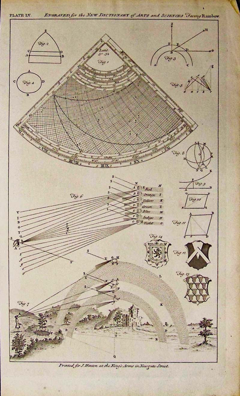 023science: 1752 Engraving printed for J. Hinton at the King's Arms in Newgate Street, Engraved for the New Dictionary of Arts and Sciences, Facing Rainbow. Plate LV. 16 x 10 in. $90