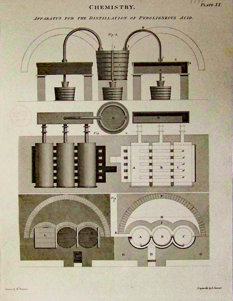 028science: 1798 Chemistry engraving showing the Apparates for the Distillation of Pyroligneous Acid in Plate XX. 10-1/2 x 8 in. $60 |