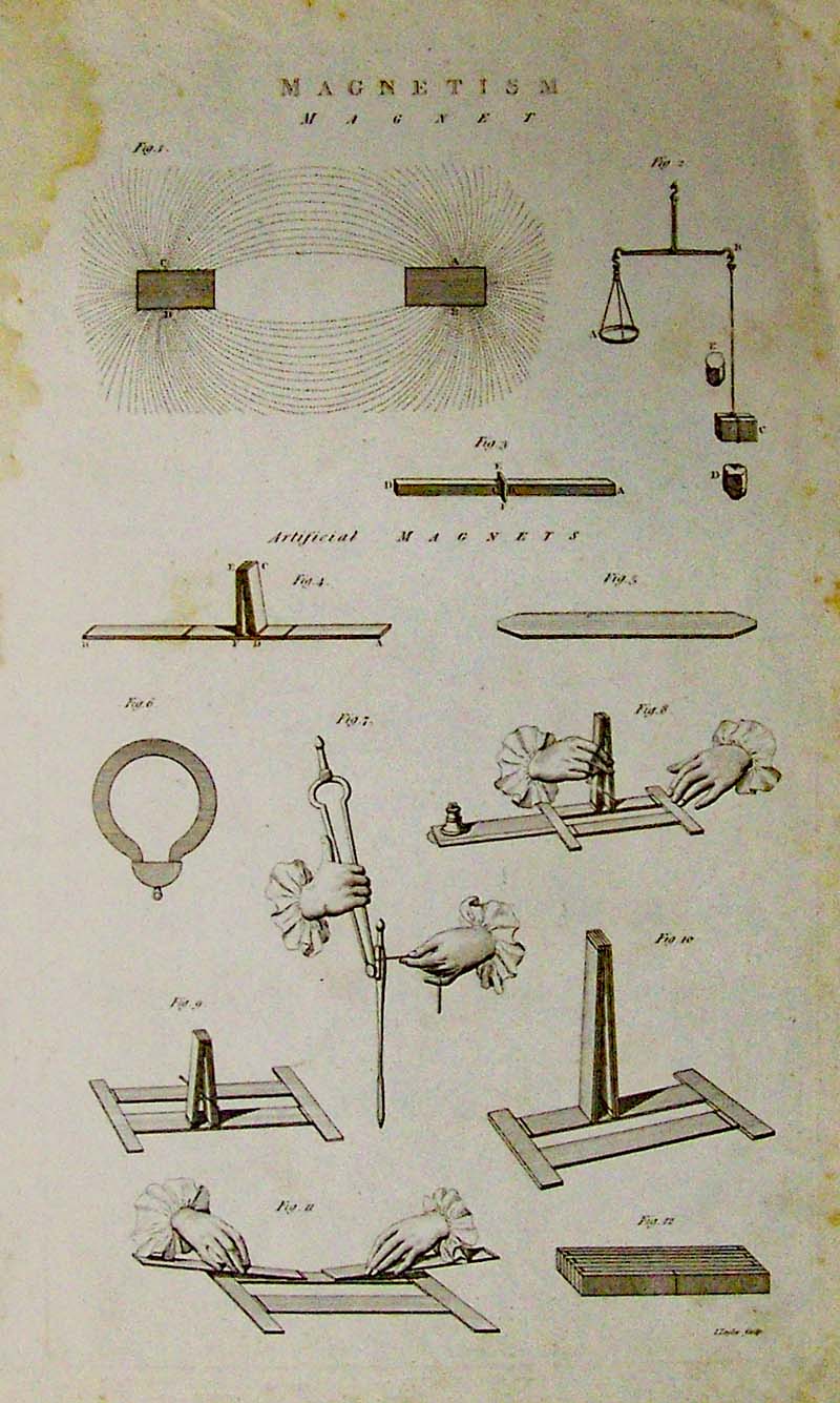 030science: C.1820 Magnetism engraving on Magnets showing twelve figures of artificial magnets. 17 x 10-1/2 in. $90