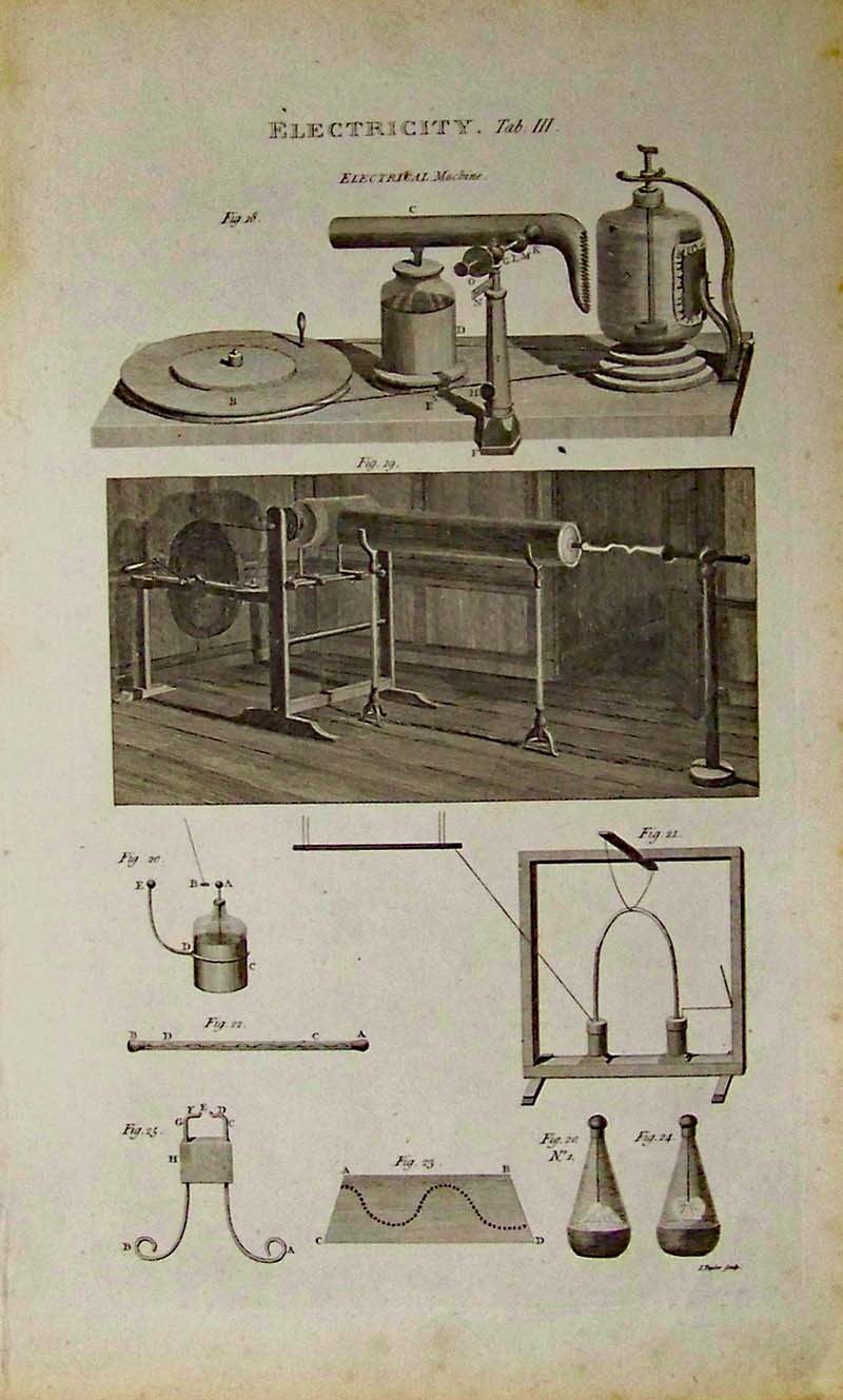031science: C.1820 Antique engraving titled, Electricity, Tab. III with several figures of Electrical Machines. 17 x 10-1/2 in. $90