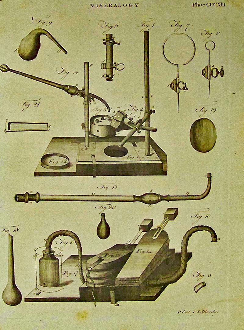 034science: 1798 Mineralogy engraving on Plate CCCXIII which shows mineral processing equipment. 10-1/2 x 8 in. $80