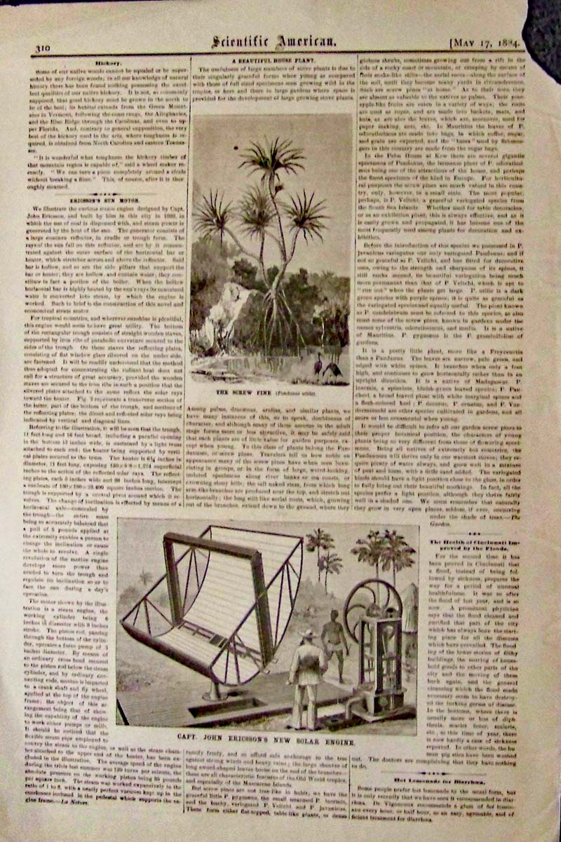 036science: Solar Engine, 1884 - Captain John Ericsson's Solar engine, an early use of steam and solar power with the entire article about it on same page. Wood engraving featured in Scientific American. Top right margin corner missing. 16 x 11 in. $30 |