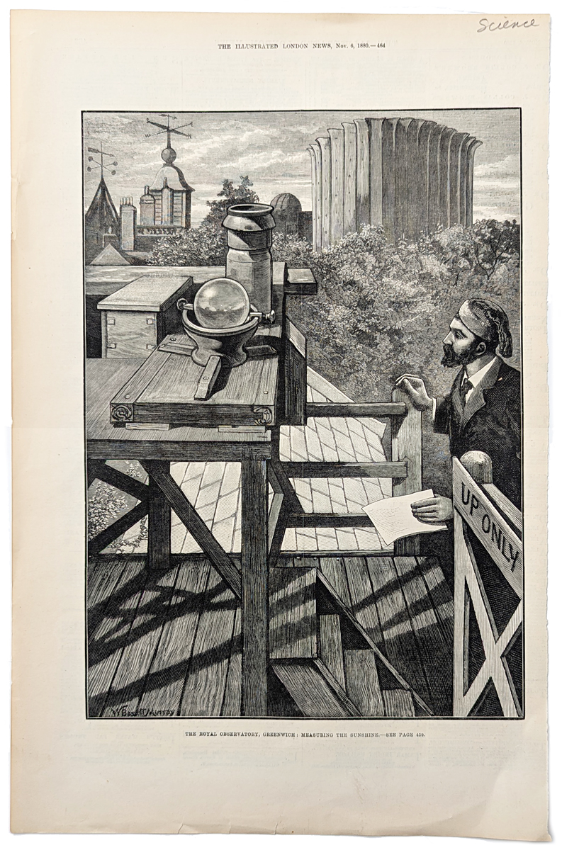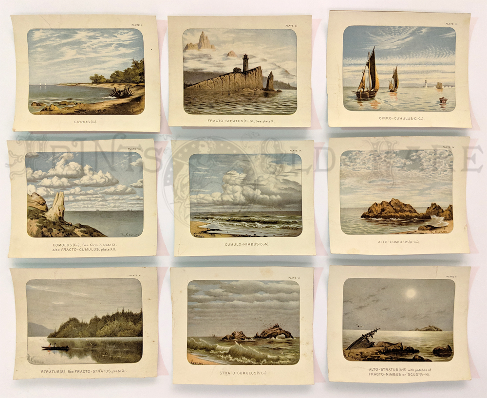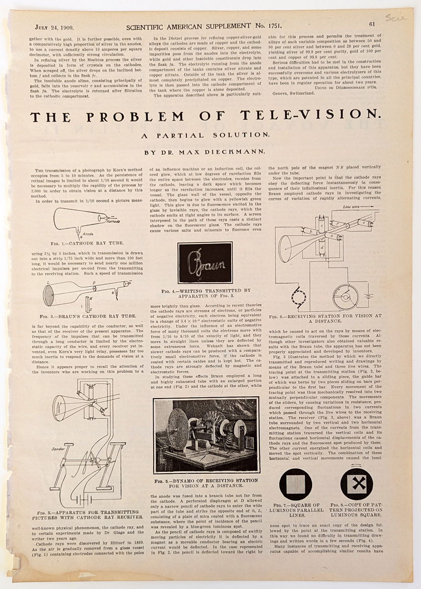 ![]() 037science: Clouds. c.1890. 9 colorful chromolithograph plates each picturing a different cloud formation. Some have folds but still a beautiful informative collection. 5 1/2 x 6 in. $90 ![]() 038science: Practical Chemistry 1748 – copper engraving view of inside a laboratory with specimens and experiments. 9 ¾ x 8 in. $45 ![]() 039science: Electrical Issue Scientific American. This issue is devoted to the ads of electronic article on heating industries, utilizing water power, electricity in home, etc. 32 pages plus color cover. 10 1/2 x 15 3/4 in. $45 ![]() 040science: The Royal Observatory, Greenwhich: Measuring The Sunshine. 1880 The Illustrated London News. Wood engraving. 10 1/2 x 16 in. $40 ![]() 041science: "The Problem of Tele-vision." A partial solution by Dr. Max Dickmann. 1909 Scientific American Supplement. Article and illustrations showing the various apparatus' for television transmission and receiving. Photogravure. 11 x 15 1/2 in. $30
