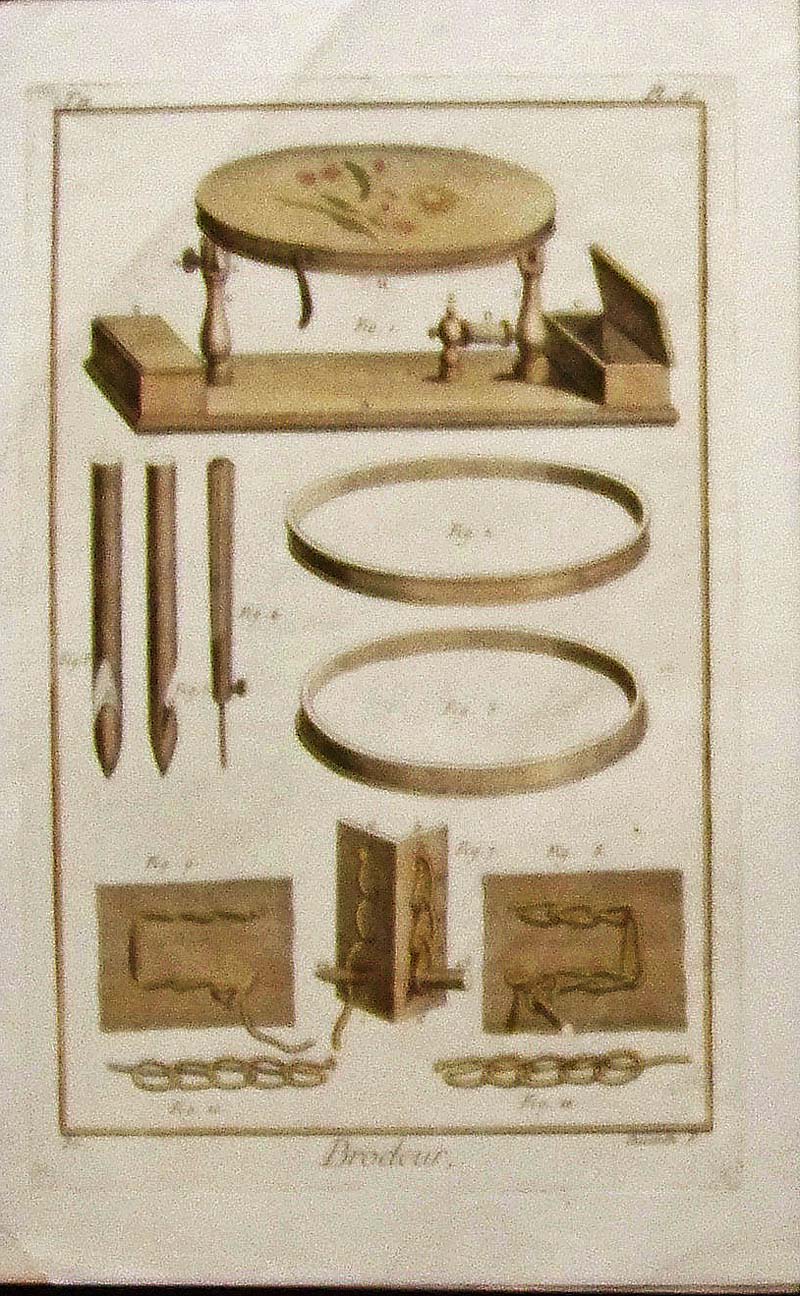 001sew: C.1750 Hand colored "Brodeur" needlework copper engraving which shows twelve figures of tools and processes in Plate 11. Also included is one page of French text. Engraving is in excellent condition. 13-3/4 x 9 in. $80