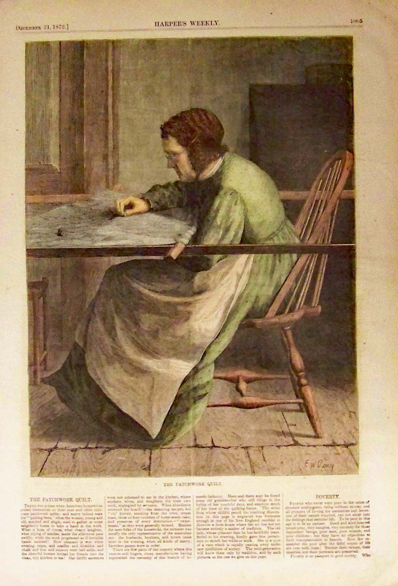 ![]() 011sew: 1875 Harper's Weekly wood engraving titled, "The Only Daughter." On the right side of image, there is a lovely poem describing the courtship of Elsie, the only daughter of the family pictured. On her mother's lap is a garment she is sewing. Elsie's father is sad because his "little girl," Elsie, will be somebody else's "baby" from now on. 16 x 10-1/2 in. $40