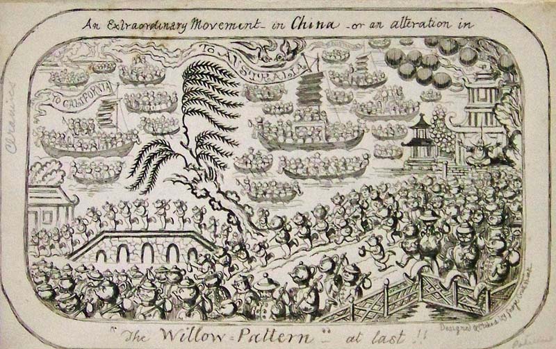005sew: "An extraordinary Movement in China -- or an Alteration in the "Willow Pattern" atlast!! Designed and etched by George Cruckshank. 6-1/2 x 4 in. $30