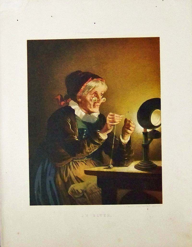 006sew: 1880 Chromolithographed image of an old woman trying to thread her needle as she peers over her glasses which is titled, "J M Alter." 13 x 10 in. $60 SOLD