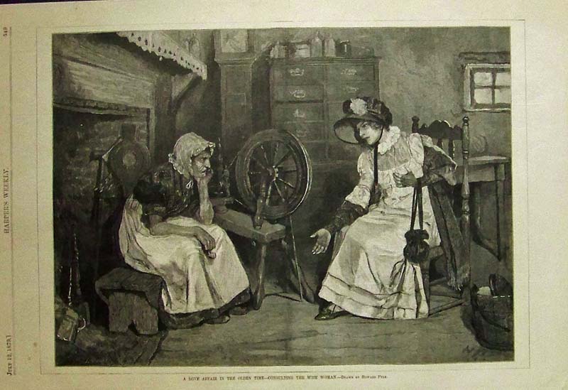 008sew: 1879 Harper's Weekly wood engraving titled, "A Love Affair in the Olden Tine -- Consulting the Wise Woman." Drawn by Howard Pyle. The wise woman is sitting by her spinning wheel. 16 x 11 in. $40