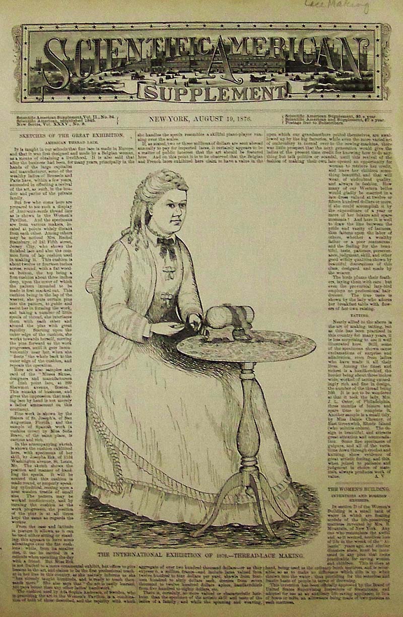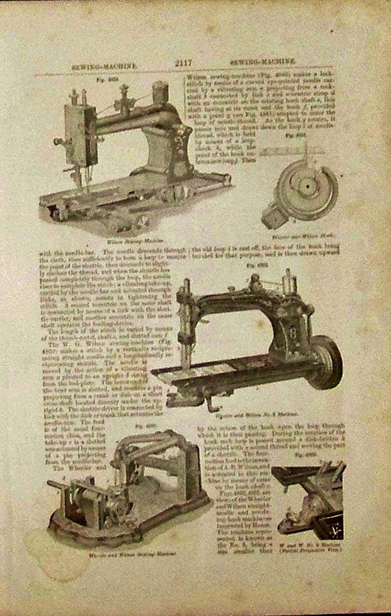 009sew: 1876 Scientific American wood engraving showing a woman making thread-lace during the International Exhibition of 1876. Article on thread-lace making surrounds her image. 15-1/2 x 11 in. $40 ![]() 010sew: Both sides of page show various sewing machines from the 1800s with article describing the parts therein. 10 x 7 in. $30 |
