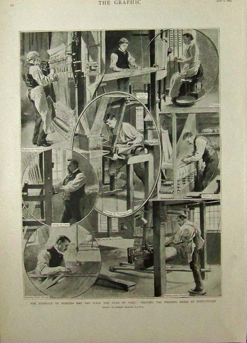 013sew: 1893 The Graphic half-tone images showing Weaving the Wedding Dress at Spitalfields for the Marriage of Princess May and H.R.H., The Duke of York. 15-1/2 x 11 in. $50
