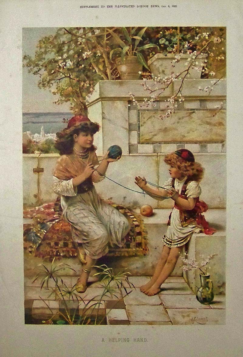015sew: 1888 Chromolithograph showing a young girl holding the yarn for her older sister as she turns the yarn into a ball to ready it for knitting. Title of image is, "A Helping Hand," and it was featured as a Supplement to The Illustrated London News. 16 x 11 in. $60