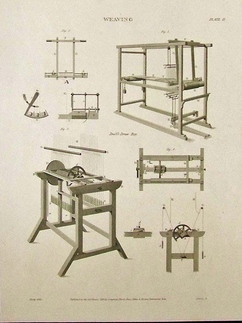 016sew: 1819 Steel engraving on Weaving, published as the Act directs, by Longman, Hurst, Rees, Orme & Brown, Paternoster Row. Various styles of weaving looms are shown in Plate II. 11-1/2 x 8-1/2 in. $30