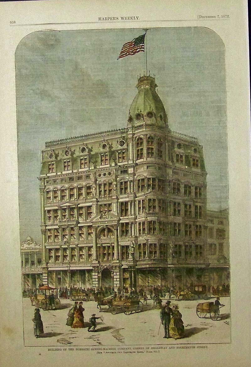 019sew: 1872 Harper's Weekly hand colored wood engraving showing the Building of the Domestic Sewing-Machine Company, Corner of Broadway and Fourteenth Street." Published in Harper's Weekly. 16 x 11 in. $50 ![]() 020sew: 1857 Wood engraved images featured in Frank Leslie's Illustrated Newspaper. The upper image shows a view of I.M. Singer and Company's Sewing Machine EStablishment; and lower view shows the Interior view of the Central Office of I.M. Singer & Co. 16 x 10-1/2 in. $40 ![]() 021sew: 1876 Harper's Weekly wood engravings showing the Murkland Ingrain Carpet Loom in the upper engraving and lower image shows the Lyall Positive Motion Loom in images titled, "The Centennial -- Improvements in Weaving." 16 x 11 in. $40 |