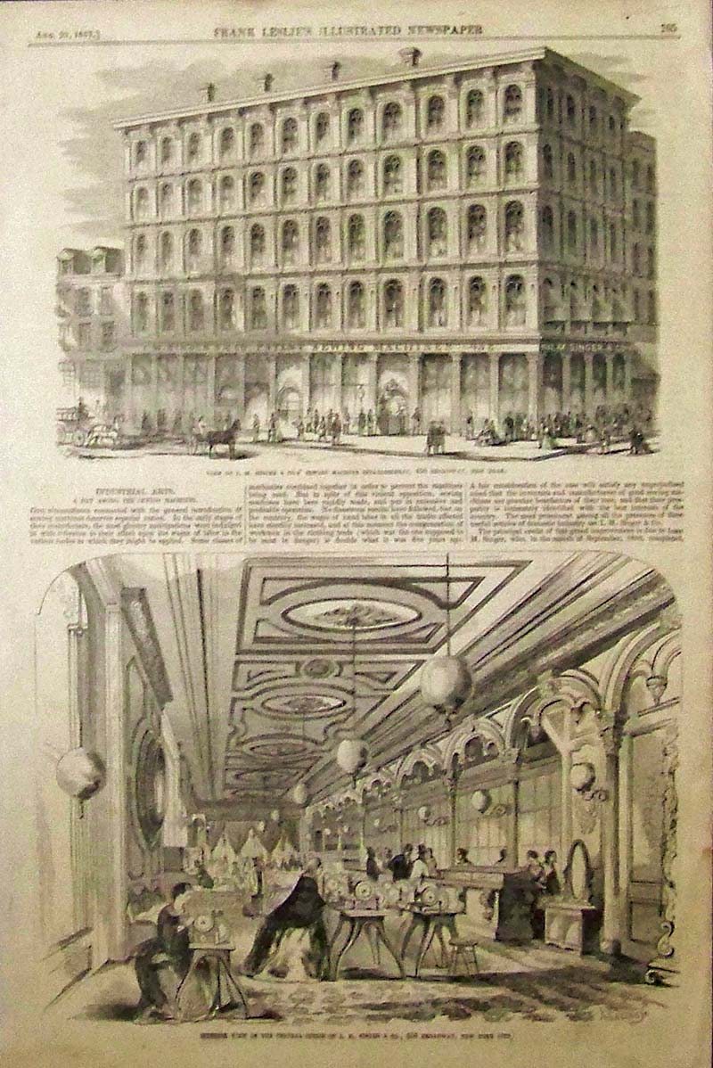 012sew: 1866 Hand colored wood engraving featured in Frank Leslie's Illustrated Newspaper showing several images of the Florence Sewing Machine Company's Works of America. 16 x 10-1/2 in.$50