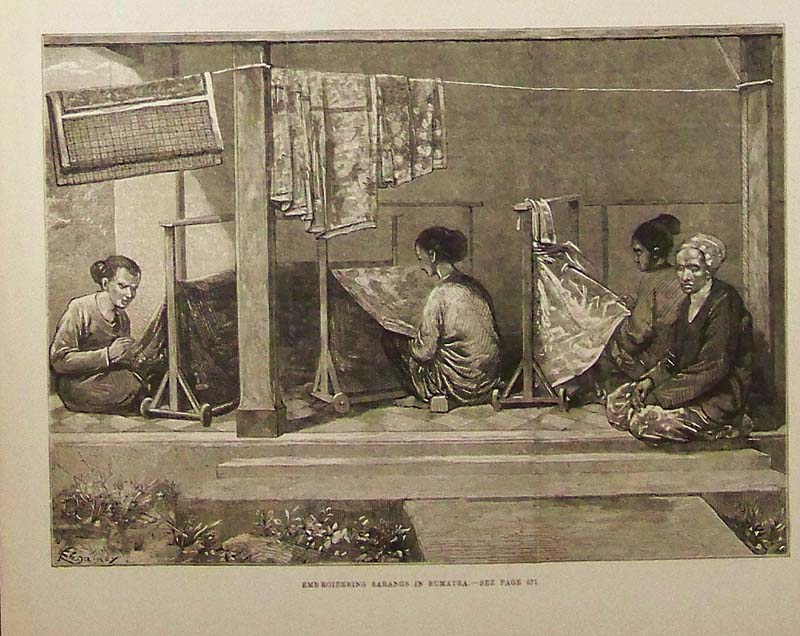 023sew: 1880 Wood engraving featured in The Illustrated London News showing Embroidering Sarangs in SUmatra. Published in The Illustrated London News. 10-1/2 x 8-1/4 in. $40