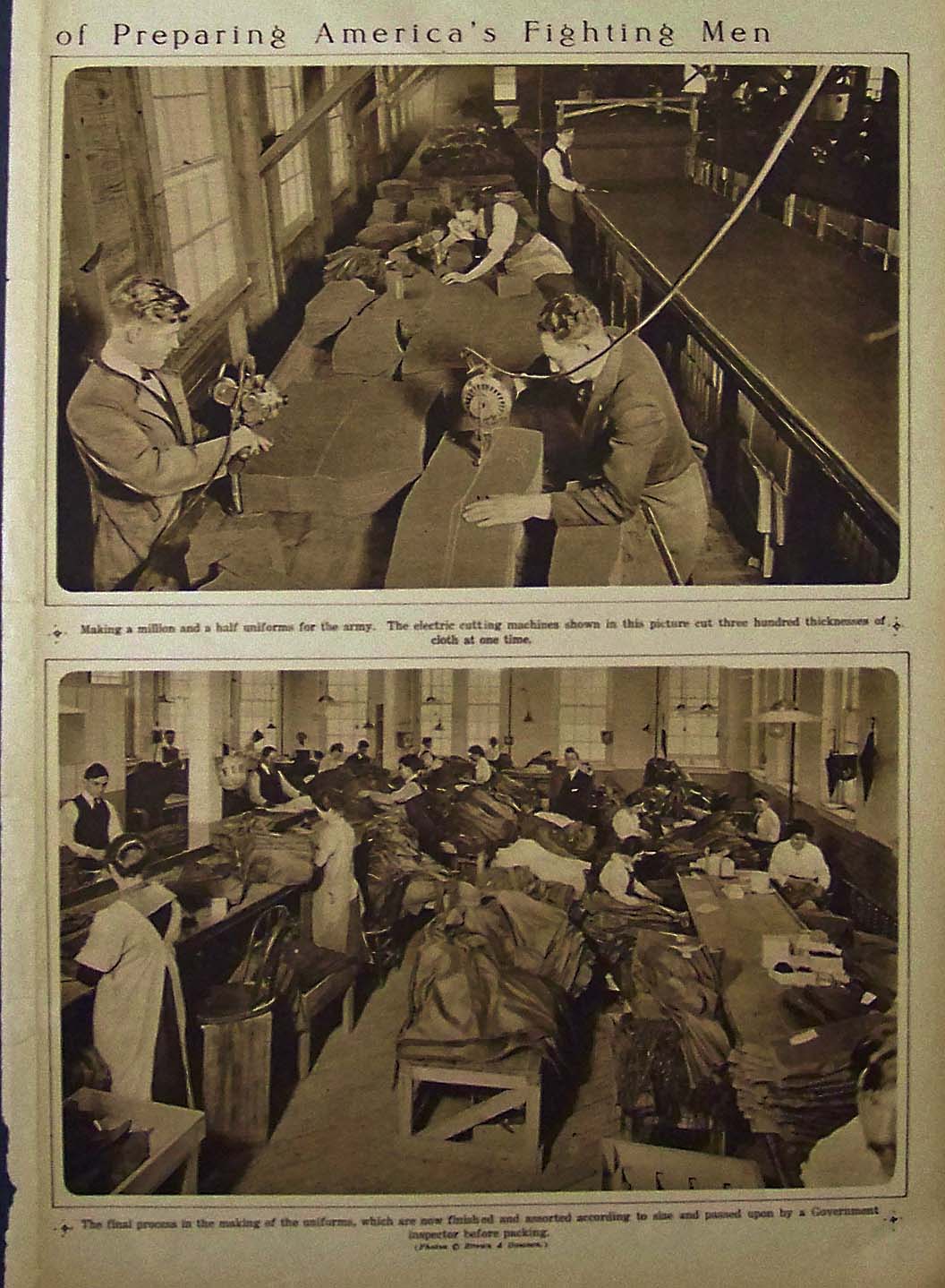 027sew: 1917 Photogravure images featured in The New York Times Mid-Week Pictorial which show the final process in the making of a million and a half army uniforms. Upper image shows the durable electric cutting machines that were capable of cutting through the thickness of 300 cloths at once. Bottom image shows the final process in the making of the uniforms and how they're assorted by sized and ready to be inspected by the Government before shipping. 16 x 11 in. $40