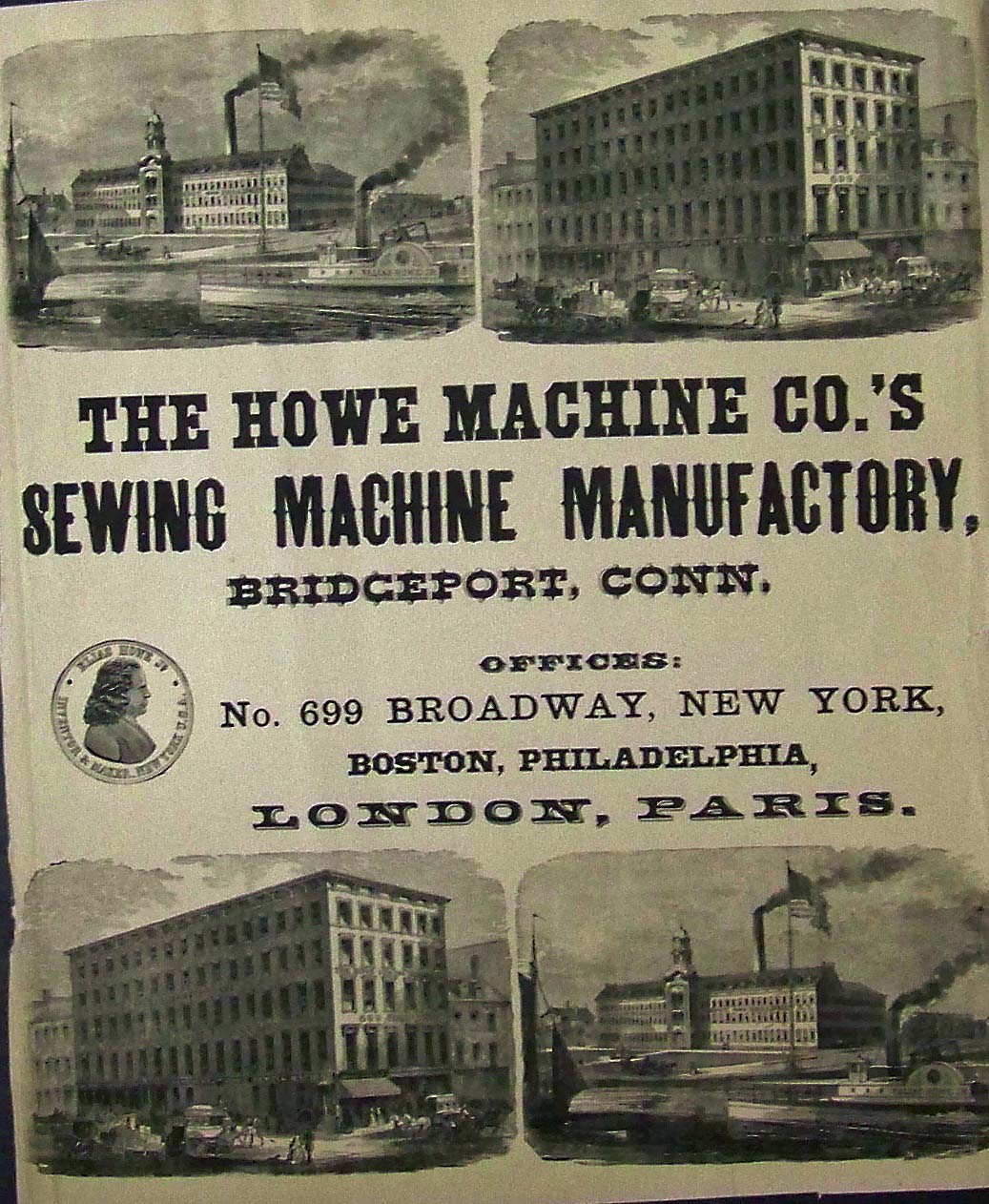 028sew: Wood engraved advertisement for the Howe Sewing Machine Company and its manufacturing location in Bridgeport, Connecticut. 16-1/2 x 13-1/2 in. $60 |