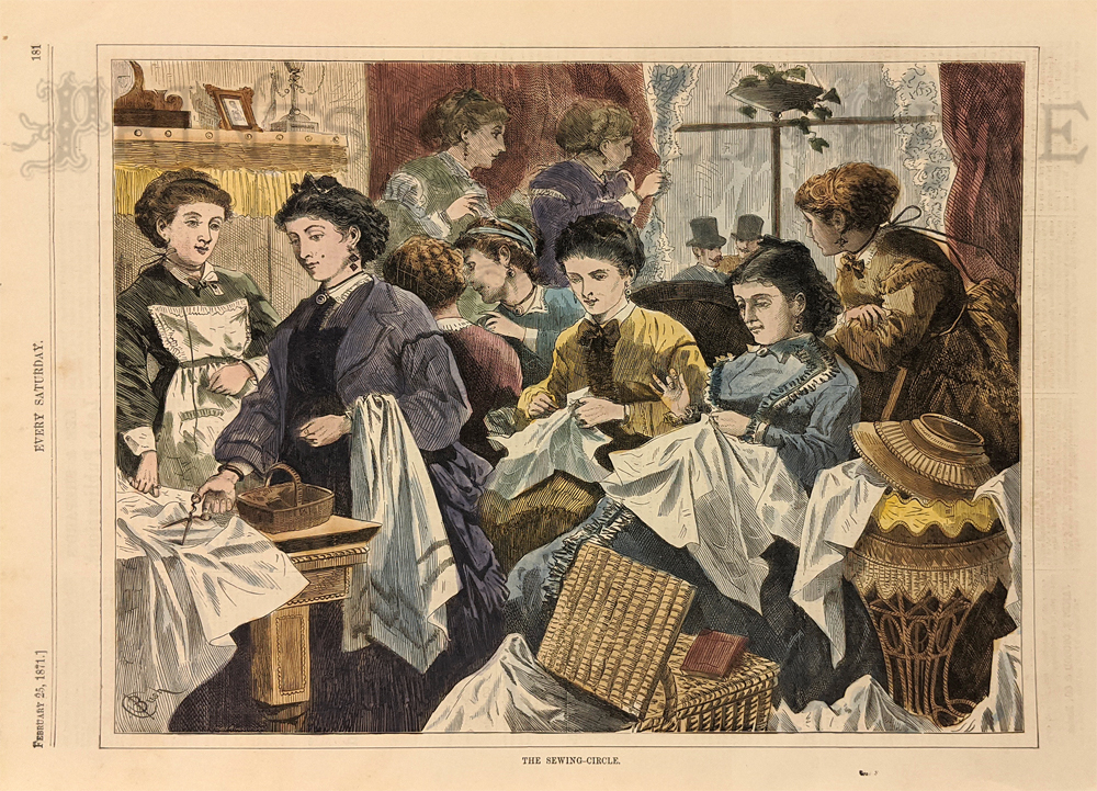024sew: 1874 Frank Leslie's Illustrated Newspaper wood engraving showing The Ladies of the Society in St.John's Guild at their Monday Evening Sewing Circle, Making Garments for the Poor in New York City. 11 x 8 in. $30