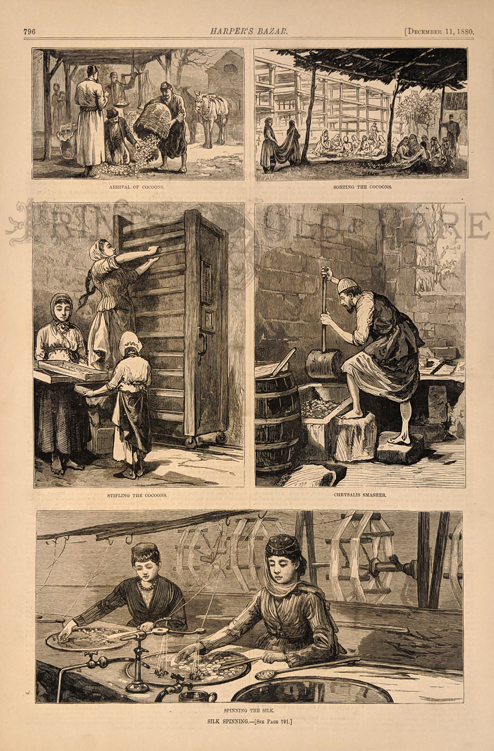 ![]() 029sew: 1920 Pine Needle Baskets. 15 creative examples in beautiful color. Ladies Home Journal. 9 ½ x 15 in. $30 ![]() 030sew: The Sewing-Circle. 1871 Every Saturday. Sewing party whilst two women gossip on the happenings outside the window. Hand colored, wood engraving. 10 5/8 x 14 5/8 in. $80 ![]() 031sew: 1913 Harper’s Weekly Cover – Showing a Seamstress fixing a tear in the boy’s trousers. 10 ¾ x 15 5/8 in. $40 ![]() 032sew: Silk Spinning 1880 Afghanistan. 5 Vignettes showing this process. Wood engraving. Harper’s Bazaar. 10 ¾ x 16 in. $30