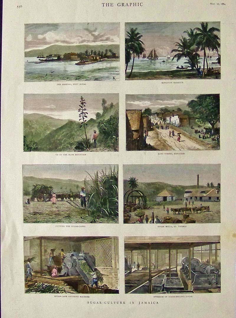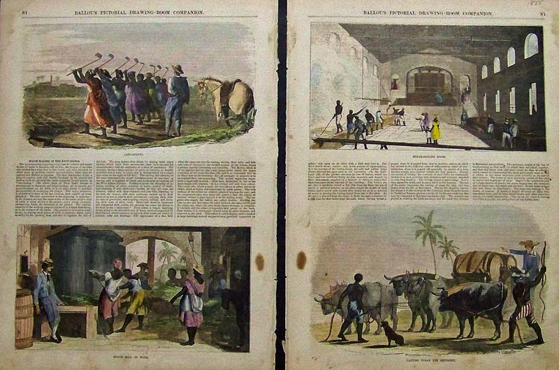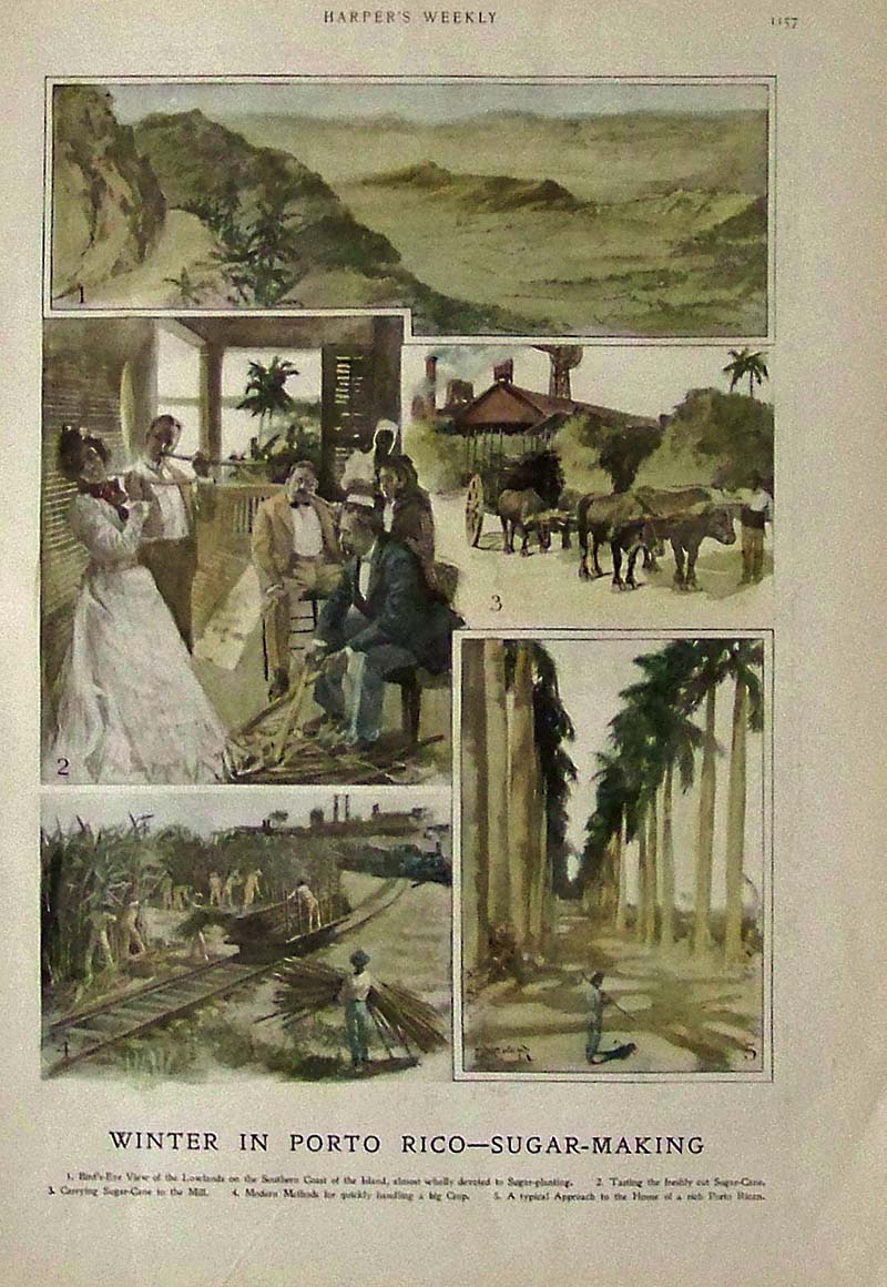 001sugar: 1901 Half-toneimage showing workers gathering and sorting the sugar cane in the fields. Title is, "Midday in the Cane-Fields." 10 x 7 in. $20 002sugar: 1895 Half-tone image of the pioneer of the sugar refinery business -- Claus Spreckels. Attached to image is short article about him. 11 x 8 in. $20 003sugar: 1919 Spreckels "On Land and Sea" booklet. Published by Employees of various Spreckels Interests for distribution at their New Home Party in San Francisco, CA. This is a very poetic account with half-tone images detailing the sugar business in the San Francisco Bay area. 9 x 6 in. $80 004sugar: C.1885 Hand colored wood engravingtitled, "Sugar Mill at Guadaloupe." Small light brown spotting in left border. 12 x 9-1/2 in. $40 005sugar: 1884 The Graphic hand colored wood engraved imagesshowing the Sugar-Culture in Jamaica. Eight images in all show various steps of preparing the sugar. 16 x 11 in. $60 |