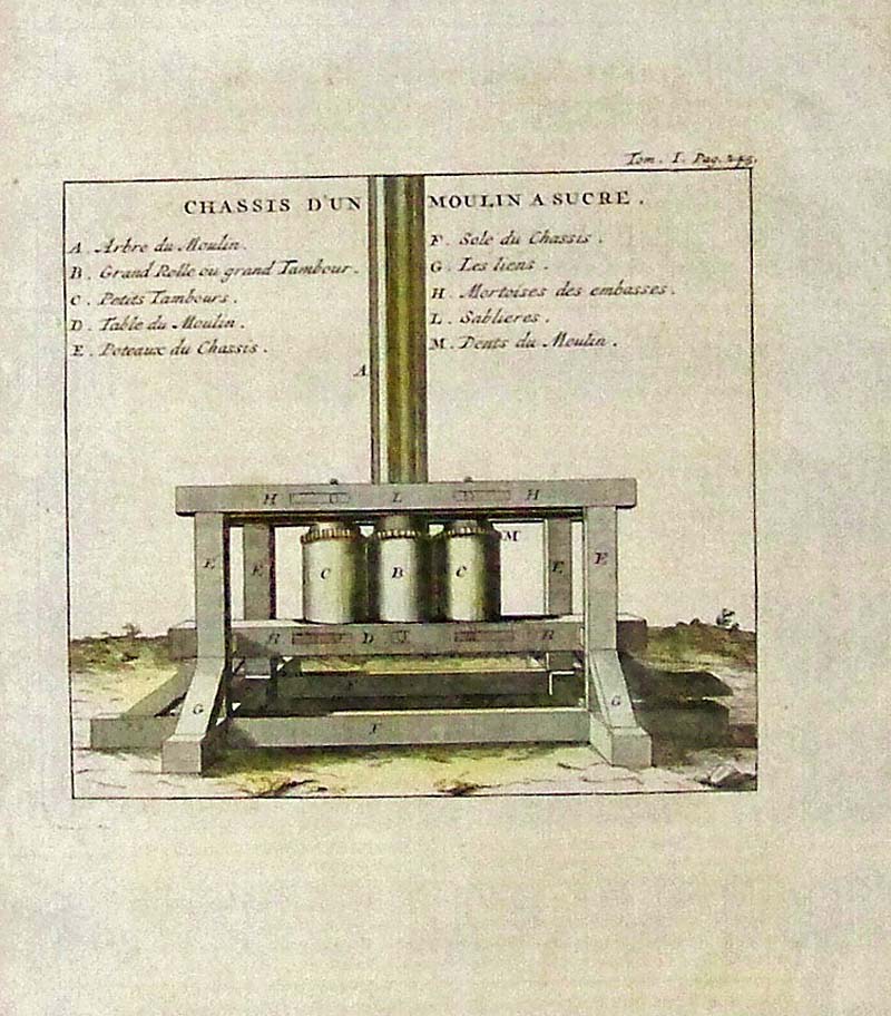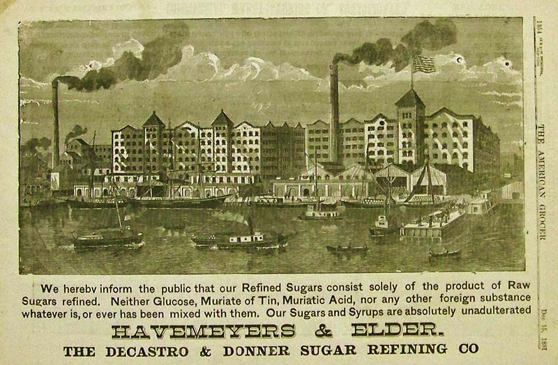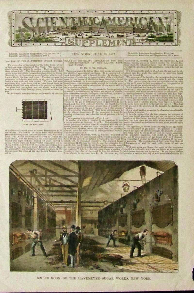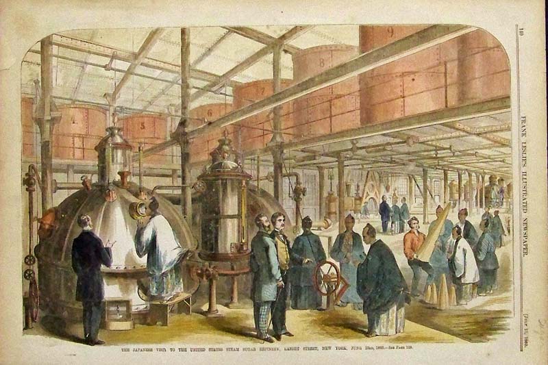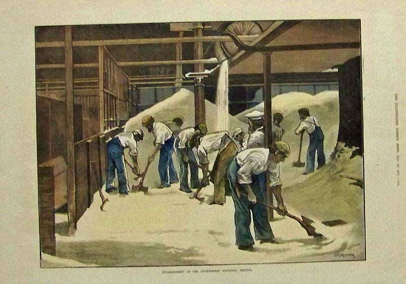 006sugar: 1881 Wood engraving from The American Grocer specifying that Havermeyers & Elder's refined sugars consist solely of the raw sugar product and not any other substance inside like glucose, Muriate of Tin, Muriatic Acid, or any other foreign substance. 15 x 9-1/2 in. $30 007sugar: 1873 Hand colored wood engraving featured in The Illustrated London News titled, "Sugar-Making at the Counterslip Refinery, Bristol." 16 x 11 in. $60 008sugar: 1860 Hand colored wood engraving showing The Japanese Visit to the United States Steam Sugar Refinery in New York. Featured in Frank Leslie's Illustrated Newspaper. 16 x 11 in. $50 009sugar: 1724 Copper engraving showing a sugar mill in an image titled, "Chassis D'Un Moulin A Sucre." 9-1/2 x 7-1/2 in. $50 010sugar: 1900 Harper's Weekly hand colored half-tone images showing Winter in Porto Rico -- Sugar Making." Image 2 shows men and women tasting the sugar cane which looks like giant cigars. 16 x 11 in. $80 |