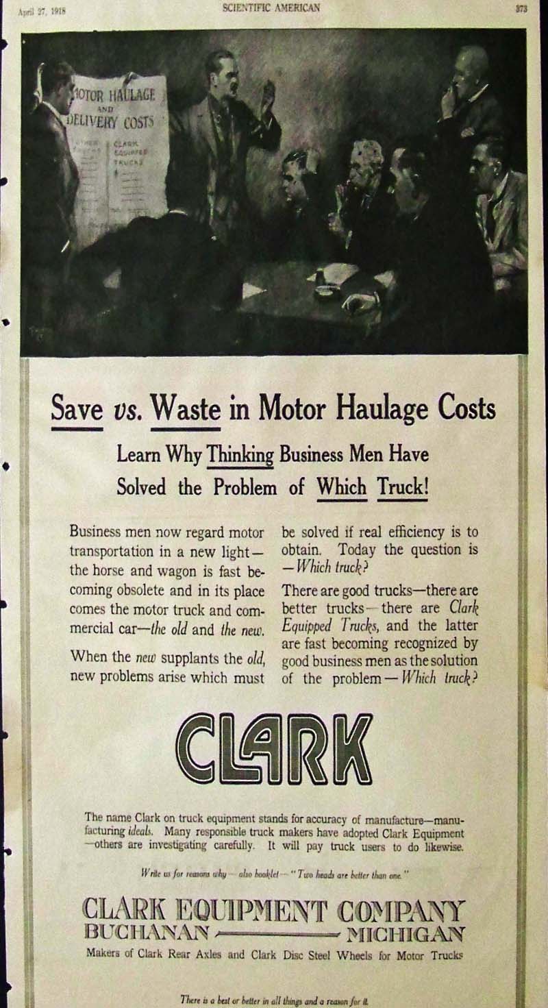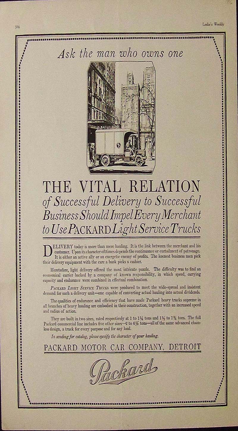 ![]() 019trck: 1913 Harper's Weekly advertisement for the Willys-Overland Company of Toledo, Ohio showing a fully-equipped automobile from that era -- all the luxuries one could ever want with a crank-starter, fancy tires, deluxe seat and perfect for driving on a warm summer day! 16 x 11 in. $30 ![]() 020trck: 1916 Packard Light Service Trucks advertisement from the Packard Motor Car Company, Detroit. Featured in Leslie's Weekly. 14 x 10-1/2 in. $30 ![]() 021trck: 1918 Scientific American half-tone advertisement for Clark Equipment Company of Michigan. Out with the old and in with the new -- Clark Equipped Trucks fit the bill. 15 x 10 in. $30 ![]() 022trck: 1919 Fulton truck advertisement featured in Scientific American -- "The Repeat Order Truck." Light Elks Club stamp on top right border. 13-1/2 x 10-1/2 in. $30 ![]() 023trck: 1917 Half-tone advertisement from The aturday Evening Post showing the Power, Strength and Endurance of GMC Trucks of Pontiac, Michigan. 14 x 10-1/2 in. $30 ![]() 024trck: 1918 Leslie's Weekly half-tone advertisement for Smith Form-A-Truck which makes a motor truck of any car. Smith Motor Truck Corporation, Chicago. 14 x 10 in. $30 |