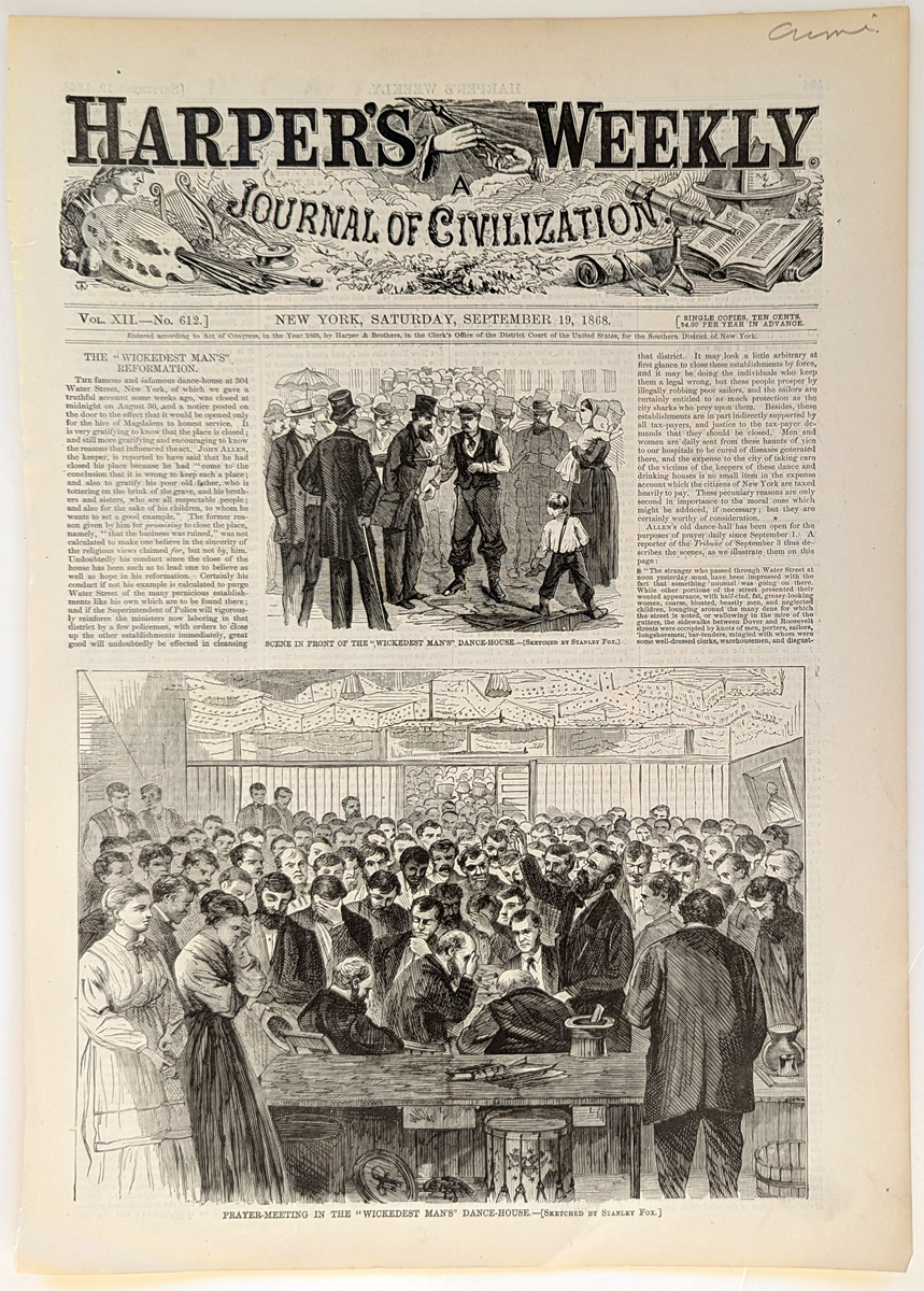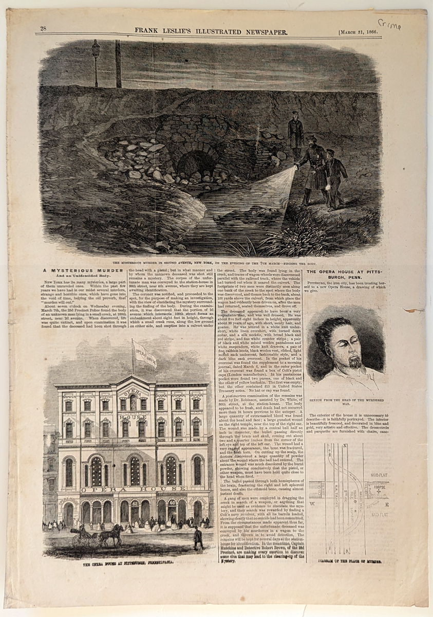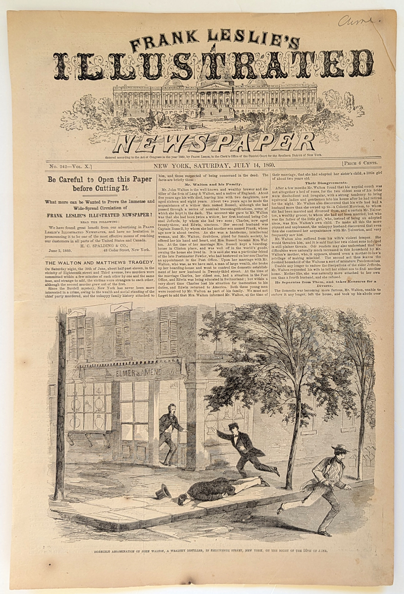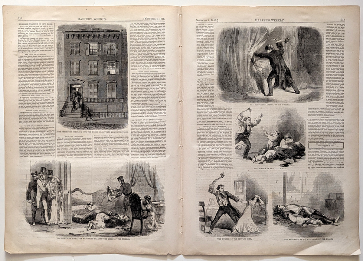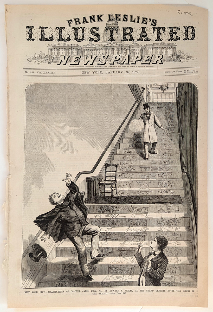 ![]() 001crime: Prayer-Meeting in the "Wickedest Man's" Dance-House. Scene in Front of the "Wickedest Man's" Dance House. 1868 Harper's Weekly. Wood engraving. 11 x 15 1/2 in. $40 ![]() 002crime: The Riot in New York - The Clothing Store of Messrs Brooks Bros, Catharine Street, Pillaged by the mob. Escaping rioters surprised by the Police. 1863 Frank Leslies Illustrated Newspaper. Wood engraving. 10 7/8 x 16 in. $40 ![]() 003crime: The Attempted Assassination of Jeremiah O'Donovan Rossa, on Chambers Street, February 2nd. The Scene Immediately after the shooting. 1885 Frank Leslies. Wood engraving. 11 x 16 in. $40 ![]() 004crime: The Attempted Assassination of Capt. Thomas Phelan - The Scene and Author of the Tragedy. Showing the wife reading to her husband. 1885 Frank Leslies. Wood engraving. 11 x 16 in. $40 ![]() 005crime: Fac-Simile of Mrs. Daniel Sickles's confession of infidelity. 1859 Harper's Weekly. Wood engraving. 11 x 15 1/2 in. $30 ![]() 006crime: Fac-Simile of the Anonymous Letter informing Hon. Daniel E. Sickles of the infidelity of his wife. 1859 Harper's Weekly. Wood engraving. 11 x 15 1/2 in. $40 ![]() 007crime: Hon. Daniel E. Sickles in prison at Washington. 1859 Harper's Weekly. Wood engraving. 11 x 16 in. $40 ![]() 008crime: The Mysterious Murder in Second Avenue, New York, on the evening of the 7th of March. - Finding the body. 1866 Frank Leslies'. Wood engraving. 11 x 16 in. $40 ![]() 009crime: Assassination of Colonel James Fisk, Jr., by Edward S. Stokes, at the Grand Central Hotel - The Scene of the Tragedy. 1872 Frank Leslies'. Wood engraving. 10 x 15 in. $40 ![]() 010crime: Horrible Assassination of John Walton, A Wealthy Distiller, in Eighteenth Street, New York, on the night of 30th of June. 1860 Frank Leslies'. Wood engraving. 10 1/2 x 15 1/2 in. $40 |