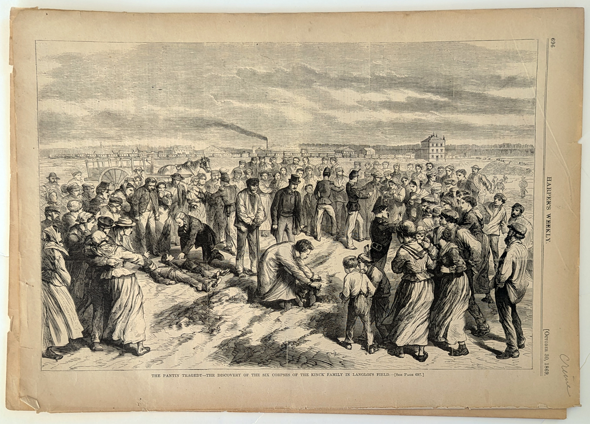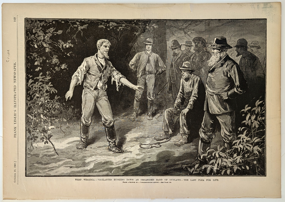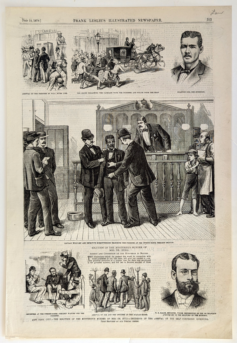 ![]() 011crime: Trial of President Garfield's Assassin - Guiteau being escorted from the court-room to the prison-van. Washington D.C. 1881 Frank Leslies. Wood engraving. 10 1/2 x 15 1/2 in. $40 ![]() 012crime: Utilizing Convict labor in the construction of the New Orleans Pacific Railroad, in Natchitoches Parish. 1877 Frank Leslies'. Wood engraving. 10 1/2 x 15 1/2 in. $40 ![]() 013crime: The doom of anarchy - suicide of Lingg, one of the condemned, by means of a dynamite cap. Illinois. 1887 Frank Leslies'. Wood engraving. 10 1/2 x 15 in. $40 ![]() 014crime: Vigilantes hunting down an organized band of outlaws - The last plea for life. West Virginia. 1887 Frank Leslies'. Wood engraving. 11 x 16 in. $40 ![]() 015crime: The arrest of Joe Coburn by Detectives Woods and Quinton, while approaching the ring, near Cold Springs Station, Indiana. Part of story describing and condemning bare-knuckles boxing. 1868 Frank Leslies'. Wood engraving. 10 1/2 x 15 1/2 in. $40 ![]() 016crime: Alfred Hicks (Alias WM. Johnson) supposed to have murdered Capt. Lurr, Oliver Watts and Smith Watts on board the Sloop E.A. Johnson. - Jackalow , the Chinese sailor, supposed to have murdered Capt. Leete and brother on board the Sloop Spray. 1860 Frank Leslies'. Wood engraving. 10 4/8 x 16 in. $40 ![]() 017crime: Body-Snatching in Philadelphia - Arrest of the depredators by Newspaper reporters - From sketches by a corresponding artist. 1882 Frank Leslies'. Wood engraving. 8 1/4 x 11 in. $30 ![]() 018crime: The Attack on Lady Florance Dixie near Windsor. 5 vignette's showing the residence, dog, Windsor road, and Lady Florence Dixie. 1883 The Graphic. Includes full article. **Stapled 11 1/2 x 16 in. $60 ![]() 019crime: The Pantain Tragedy - The discovery of the six corpses of the Knick' Family in Langloi's field. 1869 Harper's Weekly. Wood engraving. 11 x 15 1/2 in. $40 ![]() 020crime: The Oberlin Slave kidnapping case - Portraits of the Wellington Rescuers. 1859 Frank Leslies'. Wood engraving. 11 x 15 1/2 in. $40 |