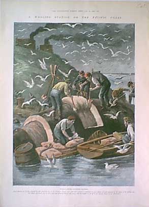 ![]() 003whl: 1877 California Whaling. Whaling station off the California coast near Monterey. Harper's front page. 11x16 in. $80 ![]() 005whl: 1885 Whaling off Long Island. Attractive hand colored engraving shows whaling crew processing their catch on the beach. Harper's. 10-1/2x8 in. $40 ![]() 006whl: 1875 Capture of Whales. Whales driven into shallow water on the coast of Shetland. Antique hand colored engraving from Harper's, including descriptive text. 16x11 in. $50 ![]() 007whl: 1892 Whaling on the California Coast. Hand colored antique litho print shows whalers stripping the blubber from their catch. Scarce 1892 print, from London Illustrated. 11x16 in. $60 |