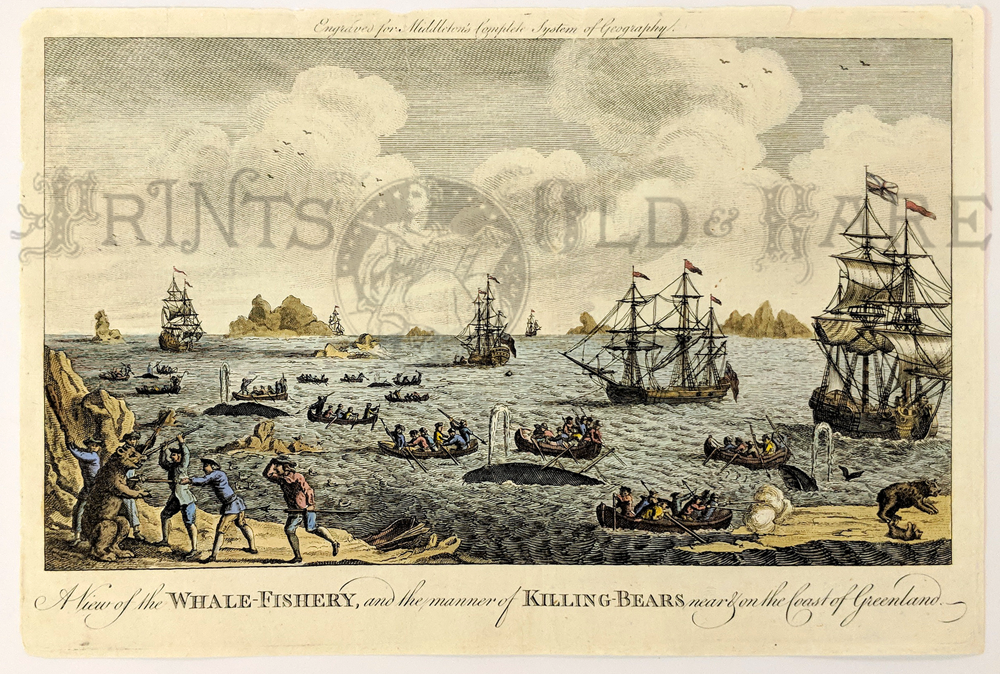 ![]() 203whl: "A View of the Whale-Fishery, and the manner of Killing-Bears near and on the Coast of Greenland." 1780 Hand colored, copper engraving. Showing several ships and about a dozen longboats with men harpooning whales. On shore, a small group of hunters are attacking a Polar Bear and others are shooting at bears from a boat. 7 1/2 x 11 in. $150 ![]() 204whl: Whaling from a Clipper Ship 1889. North Atlantic “Cutting Out the Blubber.” Hand colored, wood engraving. 10 5/8 x 15 ½ in. $80 SOLD ![]() 200whl: 1876 Whaling Fleet Stuck in Arctic Ice. Hand colored engraving from the November, 1876 edition of Harper's Weekly, titled "Arctic Perils, The Recent Disaster to the Whaling Fleet". Contains three scenes, each with its own caption: the fleet enclosed in the ice pack, the camp on a grounded iceberg, and escape of the bark "Florence". 11x16 in. $50 |