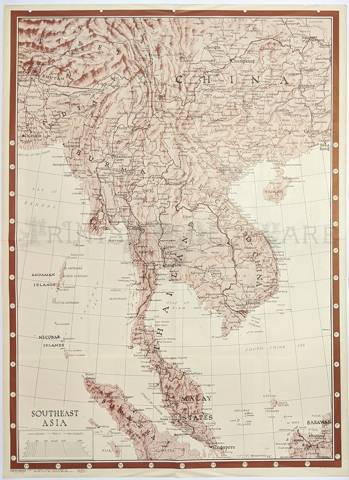 ![]() 004WorldWarII: Map of China and Southeast Asia – 1944. Newsmap published by GPO. Verso: Photos of the War Fronts. **5 hole punches top of map. 1 half punch near top right. 35 1/8 x 47 in. $90 |